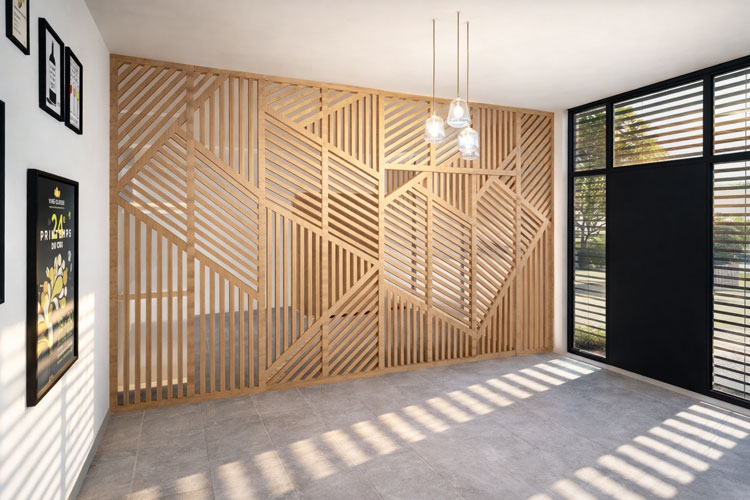 Un claustra en tasseaux de chêne vient dissimuler l’espace de stockage tout en favorisant la circulation de l’air. Le meuble présentoir, conçu sur mesure, s’étend sur toute la longueur et permet d’intégrer discrètement l’arrière-cuisine.